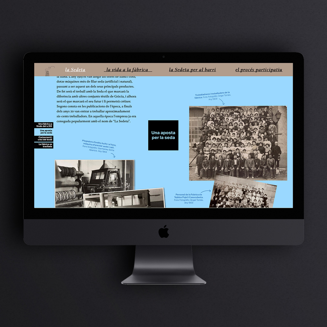 Diseño y programación web, y desarrollo gráfico de todo el contenido del "Webdoc de la Sedeta". El Proyecto de la Memoria Oral de La Sedeta recupera una parte del patrimonio histórico y cultural del "Camp d'en Grassot" y vincula el pasado y el presente del territorio. Este proyecto también quiere rendir homenaje a todas las trabajadoras y trabajadores de la antigua fábrica textil, que con el testigo de sus vivencias y sus recuerdos han contribuido a hilar la memoria oral de La Sedeta.